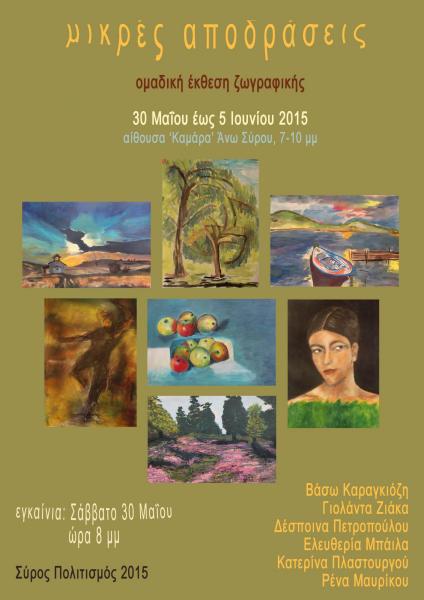 Η ομαδική έκθεση ζωγραφικής “μικρές αποδράσεις” θα παρουσιασθεί από 30 Μαΐου έως 5 Ιουνίου στην Αίθουσα “Καμάρα” στην Άνω Σύρο, στο πλαίσιο του προγράμματος “Σύρος Πολιτισμός 2015”. Τα εγκαίνια θα πραγματοποιηθούν το προσεχές Σάββατο στις 20:00.