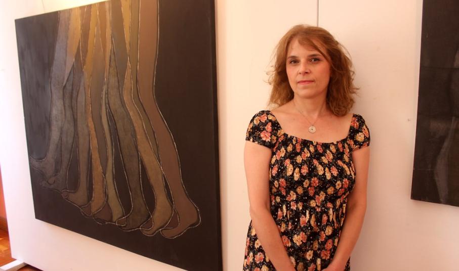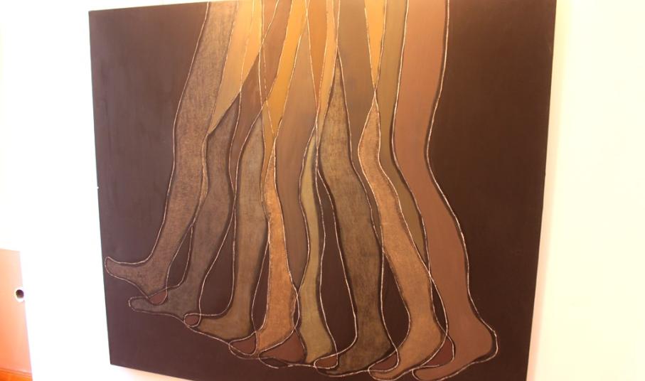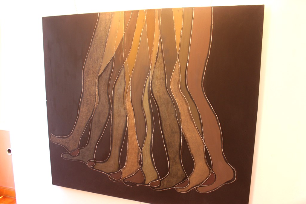 Στον καμβά, στο χαρτί και στο κόντρα πλακέ της ζωγράφου, το -μαύρο κυρίως- φόντο, το οποίο αποδίδεται με λαζούρες, χρώμα, ή τριξίματα εισέρχεται στο θέμα και διατηρεί μία διαρκή συνομιλία μαζί του. Σε κάποιους πίνακες, ο άνθρωπος δεν εμφανίζεται στατικός, αλλά αναπτύσσει κάποια κίνηση. Πόδια τρέχουν, συνυπάρχουν δίπλα σε άλλα, πέφτουν, χορεύουν. Ακόμα και στο έργο που αποτυπώνεται μία παρέα ανθρώπων, τα μέλη τους δεν επικοινωνούν.