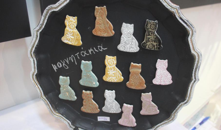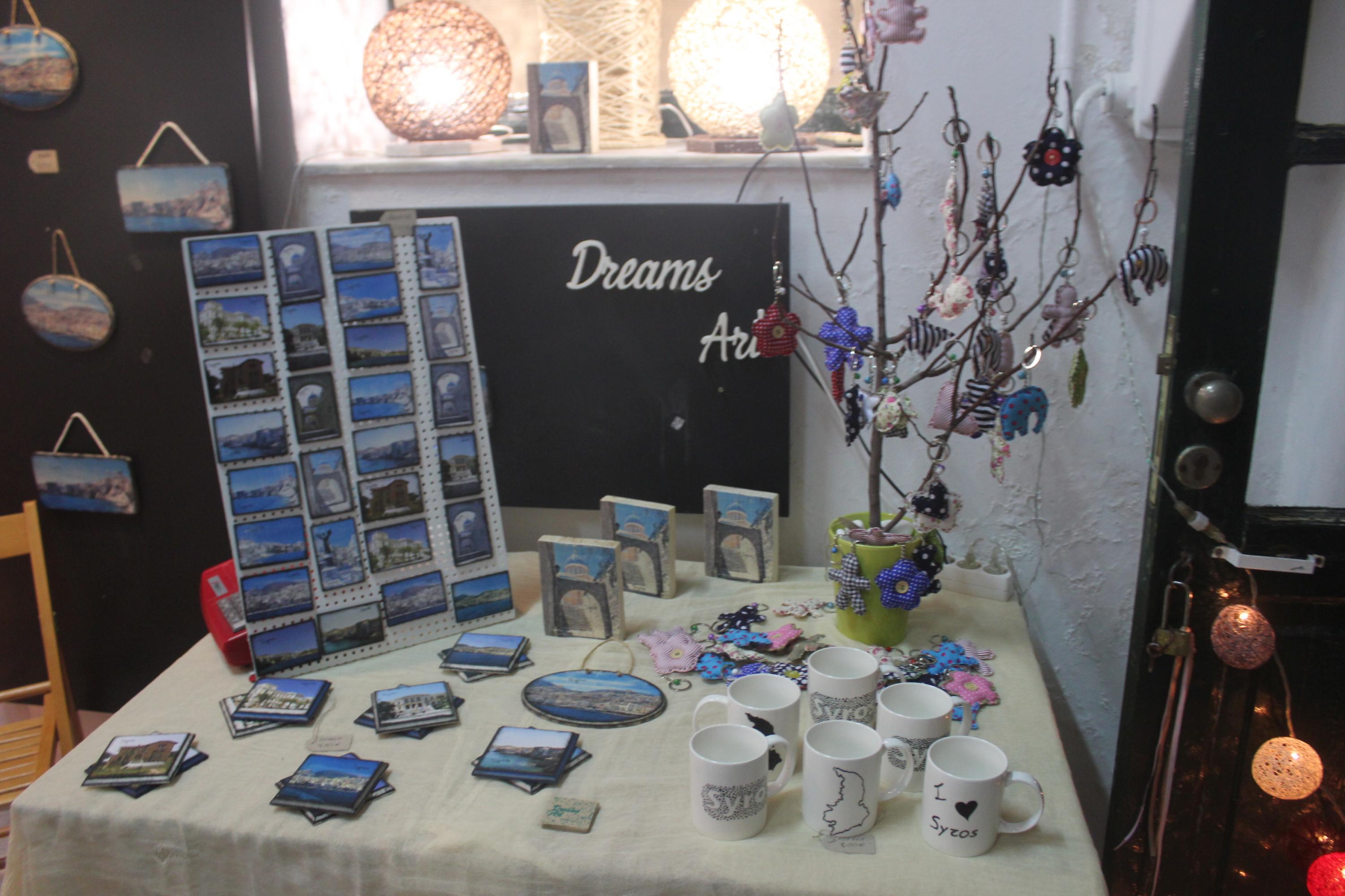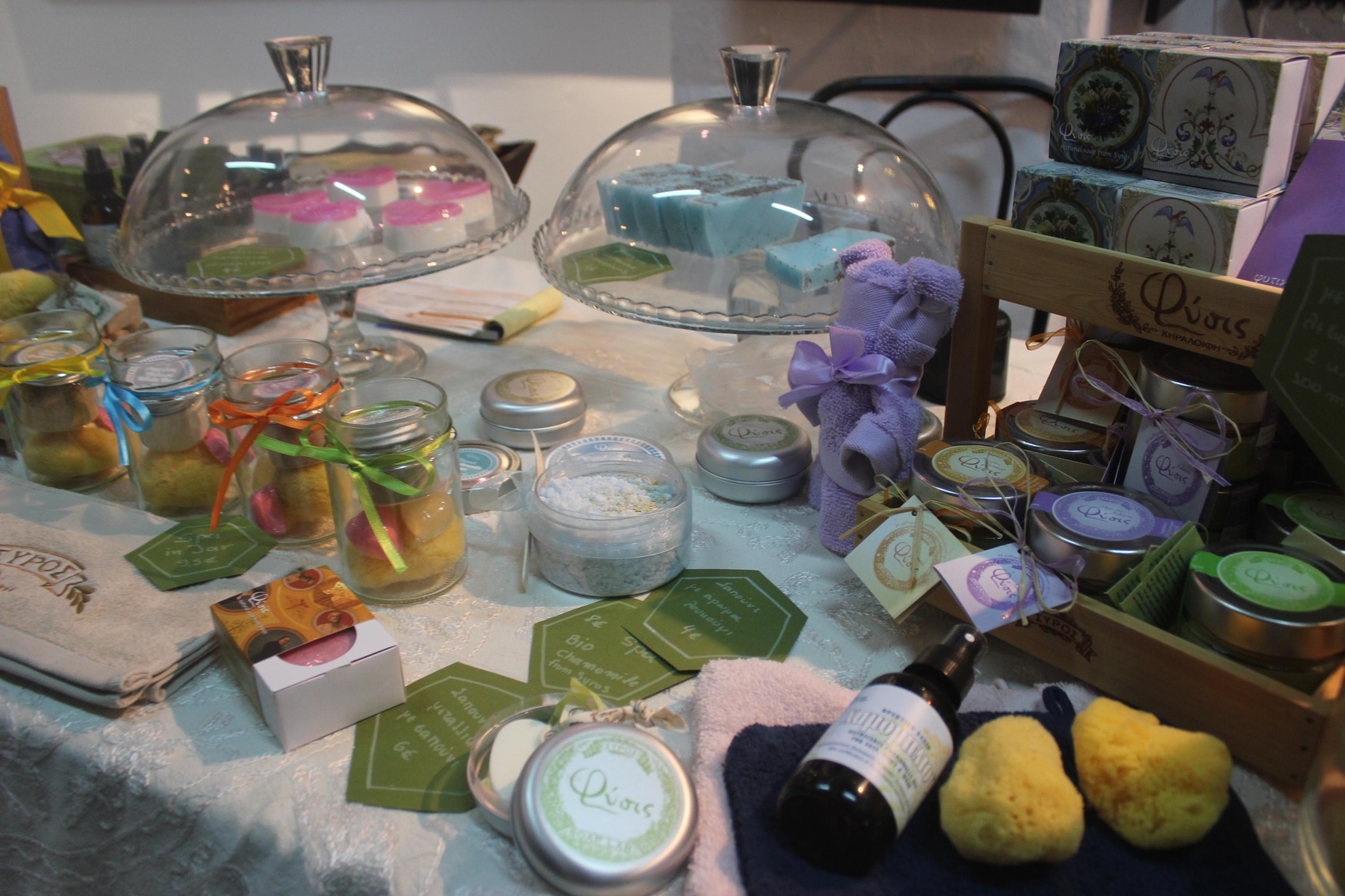 Το κοινό έχει την ευκαιρία να βρει καλόγουστα σουβενίρ, δια χειρός Μαριάννας Βακονδίου, στα οποία κυριαρχούν η Άνω Σύρος με το μπουζούκι και τον πατριάρχη του ρεμπέτικου Μάρκο Βαμβακάρη και το μπλε του Αιγαίου. Περίοπτη θέση κατέχουν τα φυτικά και φυσικά καλλυντικά της Αργυρένιας Παραμάνη «Φύσις», στα οποία περιλαμβάνονται και οι «καρποί» νέων συνεργασιών. Μεταξύ αυτών, ένα χαμομηλόλαδο για πρόσωπο, σώμα και μαλλιά το οποίο παρασκευάζεται από βιολογικό χαμομήλι που καλλιεργεί η Φραγκίσκα Βουτσίνου στον Γαλλησά. «Πρόκειται για ένα φυτικό προϊόν, χωρίς συντηρητικά, χημικά, χρώματα και αρώματα» σημειώνει, η δημιουργός. Το ίδιο χαμομήλι υπάρχει και σε ένα feet spa, βασικές ύλες του οποίου είναι ο ανθός του και το θαλασσινό αλάτι.