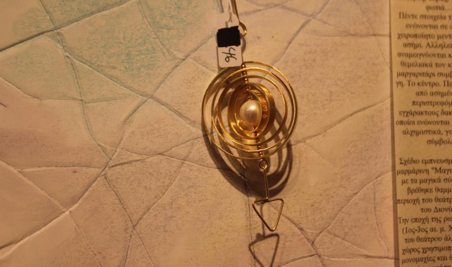 Αιθέρας, αέρας, γη, νερό, φωτιά… πέντε στοιχεία της φύσης ενώνονται στο χειροποίητο μενταγιόν από ασήμι, που είναι εμπνευσμένο από τη μαρμάρινη «Μαγική Σφαίρα» με τα μαγικά σύμβολα που βρέθηκε θαμμένη στην περιοχή του θεάτρου στο ιερό του Διονύσου. Την εποχή της ρωμαιοκρατίας (1ος-3ος αι. μ.Χ.), η μορφή του θεάτρου άλλαξε και ο χώρος χρησιμοποιήθηκε για μονομαχίες και θηριομαχίες. Πιθανόν η χρήση της ήταν για κάποια μαγική τελετή για νίκη στους αγώνες. Η Σφαίρα θεωρείται μαγικό αντικείμενο που σχετίζεται με τη λατρεία του Ήλιου και εκτίθεται σήμερα στο Μουσείο της Ακρόπολης.