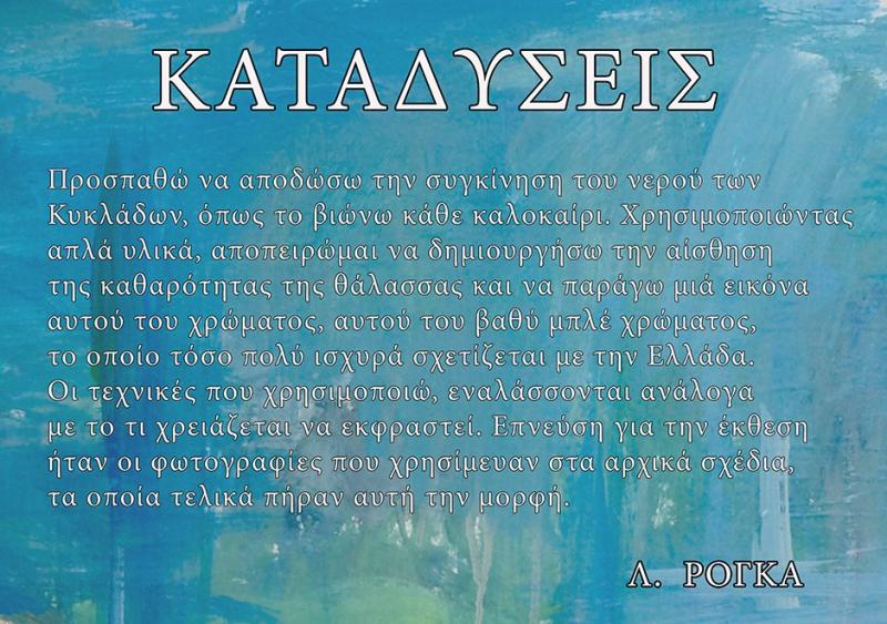 Αναμφίβολα έχω επηρεαστεί από πολύ γνωστούς ζωγράφους, γείτονες συγγενείς και φίλους τους οποίους είχα την τύχη να γνωρίσω στη διάρκεια της ζωής μου. Στα έργα αυτά που παρουσιάζω εδώ, προσπαθώ να αποδώσω τη συγκίνηση του νερού όπως το βιώνω κάθε καλοκαίρι. Χρησιμοποιώντας απλά υλικά, αποπειρώμαι να δημιουργήσω την αίσθηση της καθαρότητας της θάλασσας και να παράγω μια εικόνα αυτού του χρώματος, αυτού του βαθύ μπλε χρώματος, το οποίο τόσο ισχυρά σχετίζεται με την Ελλάδα. Οι τεχνικές που χρησιμοποιώ, εναλλάσσονται ανάλογα με το τι χρειάζεται να εκφραστεί.