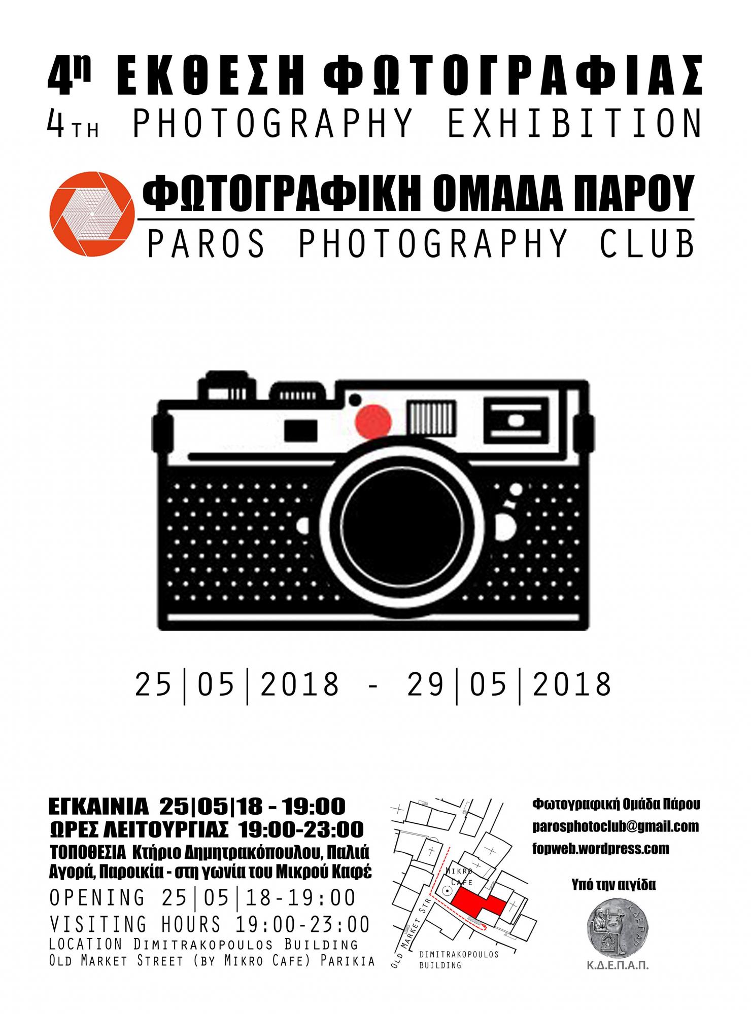H Φωτογραφική Ομάδα Πάρου παρουσιάζει τη 4η Έκθεση Φωτογραφίας η οποία θα πραγματοποιηθεί από τις 25 Μαΐου έως και τις 29 Μαΐου 2018 στο Χώρο Τεχνών του Δήμου Πάρου Κτίριο Δημητρακόπουλου. Τα εγκαίνια θα είναι την Παρασκευή 25 Μαΐου 2018 και ώρα 19:00 και η έκθεση θα είναι ανοικτή 19:00 – 23:00 για τις επόμενες ημέρες.