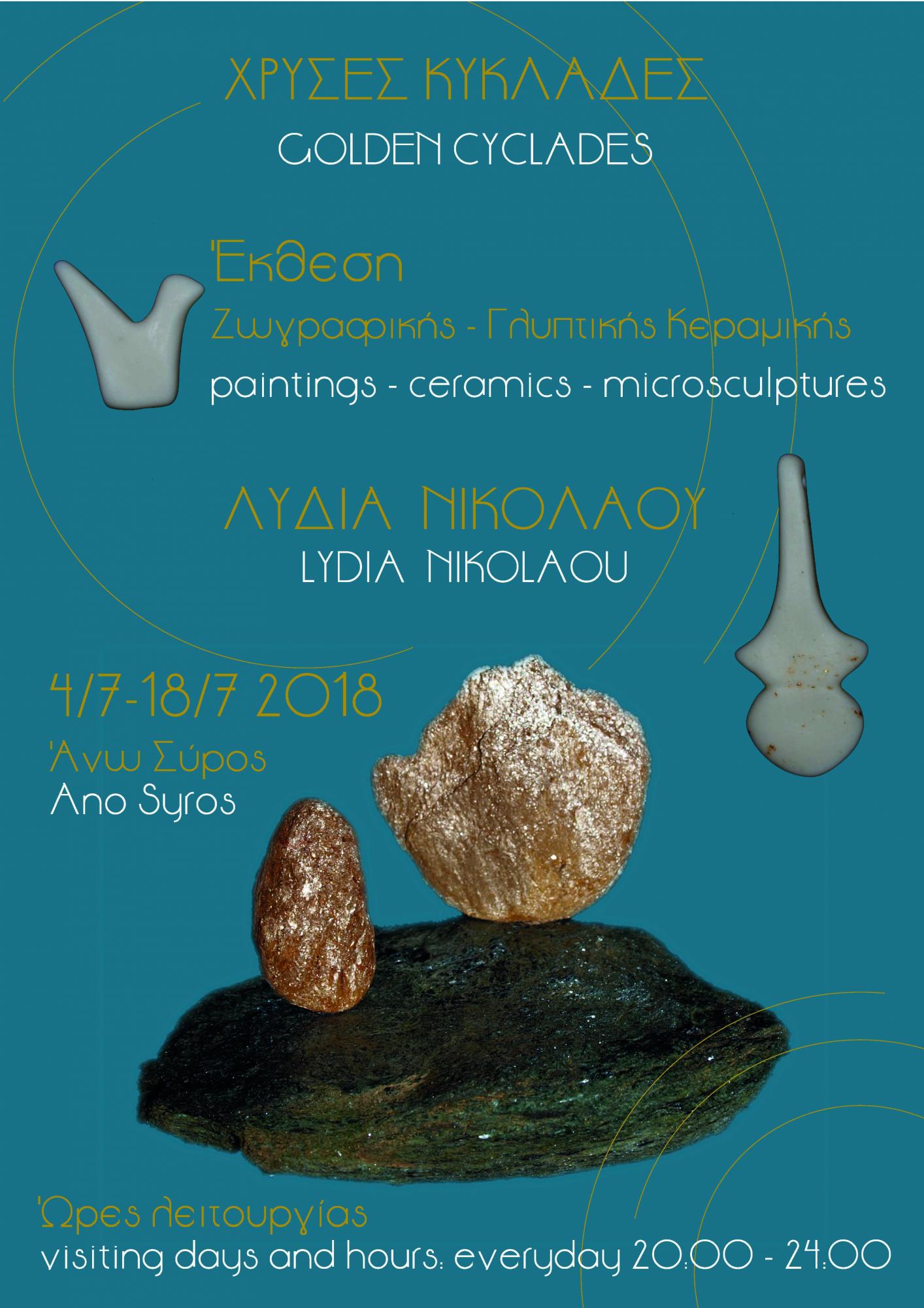 Στο πλαίσιο του πολιτιστικού προγράμματος του Δήμου Σύρου – Ερμούπολης, «Σύρος Πολιτισμός 2018», πραγματοποιείται η εικαστική έκθεση «Χρυσές Κυκλάδες», από τις 4 έως τις 18 Ιουλίου 2018, στην Αίθουσα Παραδοσιακών Επαγγελμάτων Άνω Σύρου.