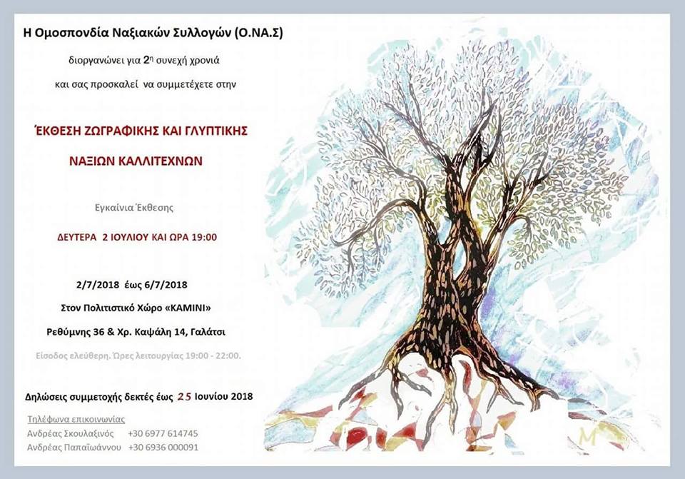 Η Ομοσπονδία Ναξιακών Συλλόγων (Ο.ΝΑ.Σ.) διοργανώνει για 2η συνεχή χρονιά την Έκθεση Ζωγραφικής και Γλυπτικής Ναξίων Καλλιτεχνών από 2 Ιουλίου έως 6 Ιουλίου 2018