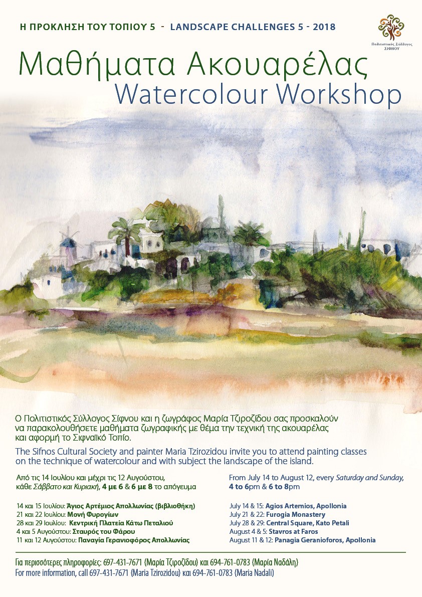 Ο Πολιτιστικός Σύλλογος Σίφνου και η ζωγράφος Μαρία Τζιροζίδου προσκαλούν μικρούς και μεγάλους και αυτό το καλοκαίρι, για πέμπτη συνεχή χρονιά, να παρακολουθήσουν μαθήματα ζωγραφικής, με θέμα την τεχνική της ακουαρέλας και με αφορμή το σιφναϊκό τοπίο.