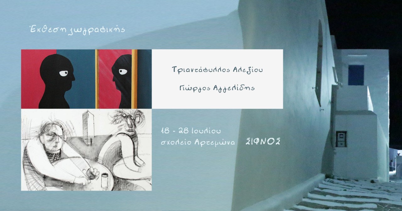 Άνοιξε χθες και θα λειτουργεί ως τις 28 Ιουλίου η έκθεση ζωγραφικής του Τριαντάφυλλου Αλεξίου & του Γιώργου Αγγελίδη. Στο κτήριο του πρώην Δημοτικού Σχολείου στον Αρτεμώνα, καθημερινά 19:00 - 24:00. Με την υποστήριξη του Δήμου Σίφνου Ο ΤΡΙΑΝΤΆΦΥΛΛΟΣ ΑΛΕΞΊΟΥ γεννήθηκε στην Καστοριά το 1984. Από τα 15 άρχισε να ασχολείται με το graffiti. Μετά το Λύκειο έφυγε για σπουδές στη Θεσσαλονίκη, όπου και σπούδασε αρχιτεκτονική στο ΑΠΘ. Ταυτόχρονα με τις σπουδές καταπιάστηκε με διάφορες εικαστικές τέχνες, όπως ζωγραφική, φωτογραφία, κεραμική, σκηνικά για θέατρο, βίντεο, animation κ.α. Από το 2011 ως το 2016 δούλευε ως φωτογράφος σε συνεταιρισμό φωτογράφων στη Θεσσαλονίκη. Παράλληλα αναλάμβανε δουλειές που σχετίζονται με τη ζωγραφική (ενδεικτικά: τοιχογραφίες στον προαύλιο χώρο των φυλακών Δομοκού με τη ΜΚΟ ΑΡΣΙΣ). Με το Γιώργο Αγγελίδη γνωρίστηκαν το 2016 στα μαθήματα ζωγραφικής που παρέδιδε ο δεύτερος, ανοιχτά και δωρεάν σε χώρο στη Θεσσαλονίκη.