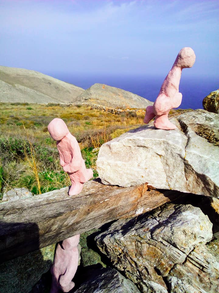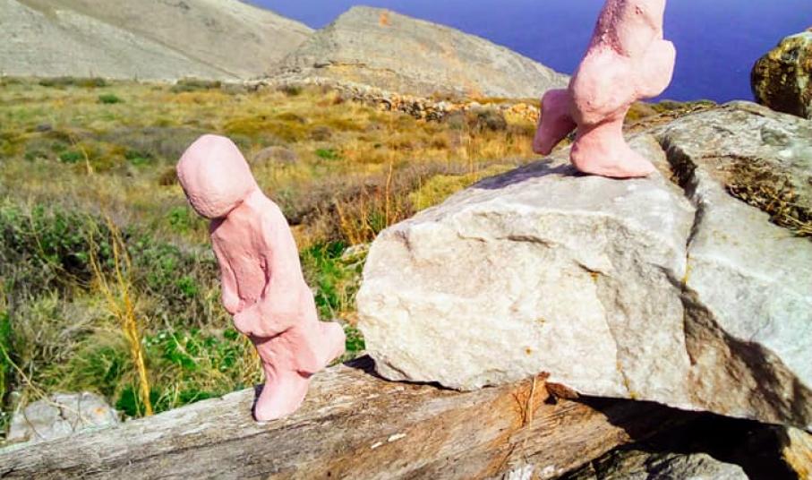 Μικρά πήλινα ανθρωπάκια, που φέρουν τη διαχρονικότητα του ψημένου άργιλου και μια σαφή αναφορά στην αφαιρετική προσέγγιση των κυκλαδίτικων ειδωλίων, μαγνητίζουν τα βλέμματα των επισκεπτών της βορειοανατολικής πλευράς της Σύρου.