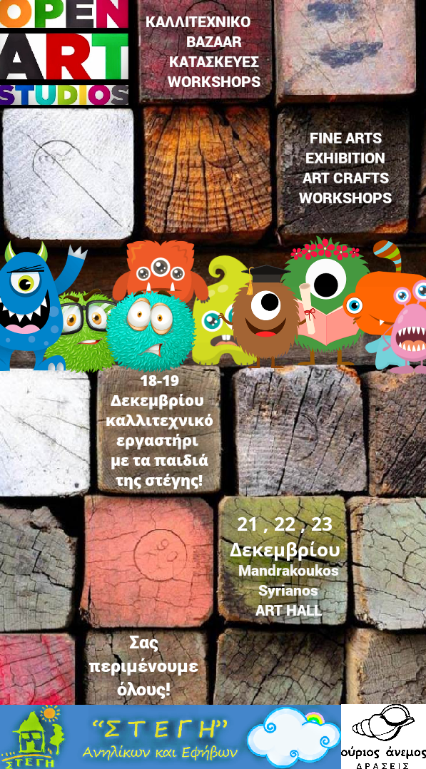 Από αύριο η ομάδα Syros Open Art Studios και τα μέλη της ξεκιναμε τις χειμερινές μας δράσεις με ένα πάρα πολύ ενδιαφέρον και δημιουργικό εργαστήρι με τα παιδιά της στέγης.Εν όψη των εορτών θα δημιουργήσουμε με την βοήθεια των εκπαιδευτών μας κατασκευές και διάφορα άλλα όμορφα χρηστικά αντικείμενα και θα συνεχίσουμε δυναμικά 21, 22, 23 Δεκεμβρίου με μια ομαδική έκθεση μικρών εικαστικών έργων, χειροποίητων προϊόντων, αλλά και με πολλές πολλές ζωντανές δράσεις στον φιλόξενο πολυχώρο τέχνης Μανδρακουκoς Συριανός Art Hall.