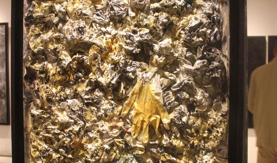Όπως εξηγεί, η έμπνευση μπορεί να βρίσκεται ακόμη και στα μικρά πράγματα, τα καθημερινά. Αυτό μπορεί να το διαπιστώσει κανείς θαυμάζοντας το έργο του με βασικό υλικό γάντια μιας χρήσης, τοποθετημένα σε υγρό γυαλί. «Θέλω να περάσω ότι τα πάντα είναι τέχνη και πως πρέπει να αγαπάμε οτιδήποτε υπάρχει γύρω μας», δηλώνει στην εφημερίδα. Στην ίδια λογική κινείται και η χρήση τόσο πλαστικών μαχαιριών που συνόδευαν την παραγγελία έτοιμου φαγητού, όσο και του υλικού περιτυλίγματος των έργων του κατά τη μεταφορά τους στη Σύρο για τη δημιουργία της σύνθεσης που φιλοξενείται σε έναν από τους χώρους της έκθεσης.