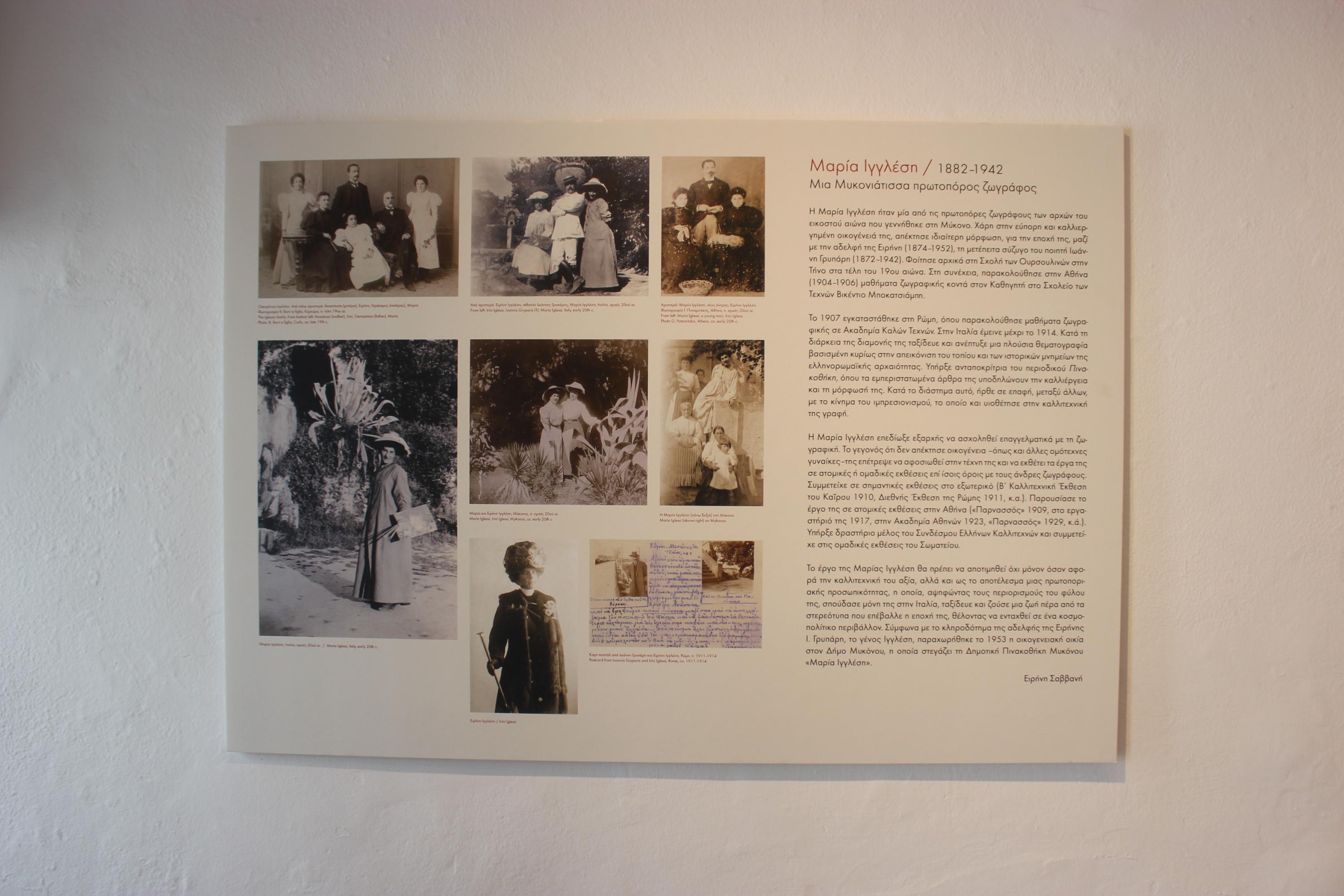 Αυτό το καλοκαίρι, οι επισκέπτες της Δημοτικής Πινακοθήκης Μυκόνου – Αίθουσα Ματογιάννι έχουν την ευκαιρία να παρακολουθήσουν την καλλιτεχνική πορεία της Μυκονιάτισσας πρωτοπόρου ζωγράφου Μαρίας Ιγγλέση (1882-1942), μέσα από δεκαέξι έργα της συλλογής του Δήμου Μυκόνου, τέσσερα έργα της Λαογραφικής Συλλογής Μυκόνου, αλλά και έργα ιδιωτικών συλλογών.