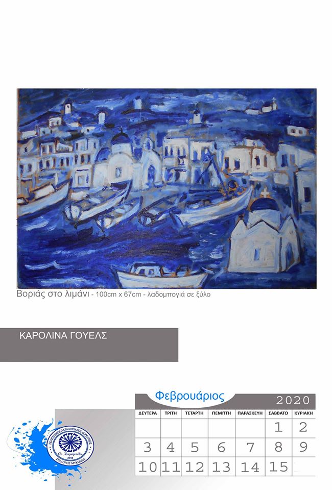 Με τον τίτλο «Σύγχρονοι Μυκονιάτες Ζωγράφοι», παρουσιάζουν έργα τους, μαζί με το έργο που θα τυπωθεί στο ημερολόγιο, οι Αρμακόλα Τζωρτζίνα, Λυδία Βενιέρη, Βερώνης Πέτρος, Γαλάτης Γιάννης, Καρολίνα Γουέλς, Ευγενία Γρυπάρη, Δέρπαπας Μιχάλης, Danilo Tani, Άννα Ελευθερίου, Γιάννης Ζουγανέλης, Βασίλης Καβουρίδης, Ελένη Μανάλη, Ελένη Μάντζαρη Νικολακάκη, Ειρήνη Μονογιού, Gilles Ballini, Bogdan Kopec, Πάνος Μπρούσαλης, Μάκης Μωράκης, James North, Μαρίνα Πετρη, Brian Piccini, Μερκούριος Στεφάνου, Άντζελα Χειμωνά και Ιωάννα Χειμωνά.