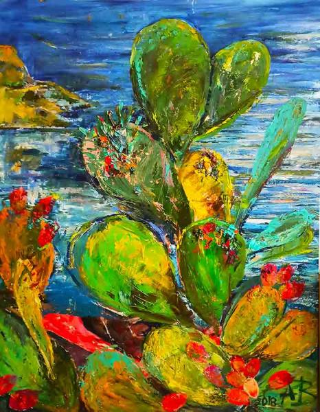 Πρόκειται για σειρά έργων που έχει αναπτυχθεί στους άξονες της παρατήρησης και της εντύπωσης του φυτικού κόσμου της αυτοφυούς φραγκοσυκιάς και των “μυστικιστικών” αγριολούλουδων του Κυκλαδίτικου τοπίου σε στιγμές μέσα στο χρόνο. Κάκτοι και φυτικά συμπλέγματα με φόντο τον ουρανό ή τη θάλασσα, εμπνέουν με τις δυναμικές γλυπτικές τους φόρμες και την πολυμορφία των συσχετίσεών τους με το φως και το περιβάλλον. Τα αγριολούλουδα αποτελούν βινιέτες μοτίβων και χρωμάτων σαν μια μικρή περφόρμανς στην άκρη του μονοπατιού πάνω ή δίπλα από τη θάλασσα. Άπειροι συνδυασμοί συνθέσεων και η χαρά του χρώματος ανεξάντλητη μέσα από την αρχέγονη ανθρώπινη ζωγραφική χειρονομία. Έτσι, από τη σκοπιά της Περσεφόνης, του Ερμή, της Δήμητρας και μέσα από τις παλλόμενες εξάρσεις της αέναης ανάπτυξης της φραγκοσυκιάς και της φυσικής κίνησης στο ξηρό τοπίο των Κυκλάδων, η εικαστικός προσκαλεί όλους τους “Άλλους” να μοιραστούμε τη ζωγραφική δράση σε στιγμές φωτεινής παρατήρησης της φύσης.