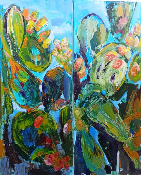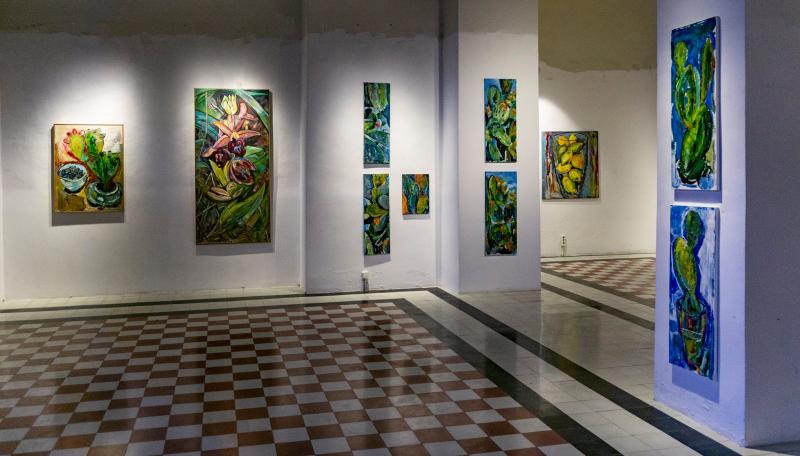 Η ατομική έκθεση της Αγγελικής Μπρινόσβαλη “Cactus & Others II” φιλοξενείται στην Αίθουσα Τέχνης «Γιάννη & Ελένης Βάτη» - μια όαση δροσιάς και χαράς τόσο σαν χρωματική αίσθηση από τα έργα της εικαστικού όσο και σαν μοναδικής ομορφιάς διατηρηταίος χώρος του Δημαρχιακού Μεγάρου Ερμούπολης, σχεδιασμένου από τον Ερνέστο Τσίλλερ.