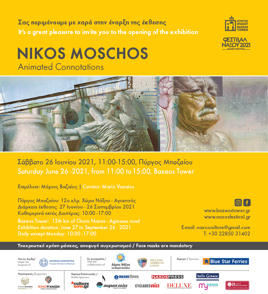 Δεκαοχτώ έργα ζωγραφικής του Νίκου Μόσχου, νέα αλλά και παλαιότερα, κάποια προερχόμενα από Ιδιωτικές Συλλογές και τη Γκαλερί Ζουμπουλάκη, μαζί και δύο γλυπτά, που για πρώτη φορά φιλοτεχνεί ο καλλιτέχνης, παρουσιάζονται από τις 27 Ιουνίου έως τις 26 Σεπτεμβρίου 2021 στον Πύργο Μπαζαίου, στη Νάξο.