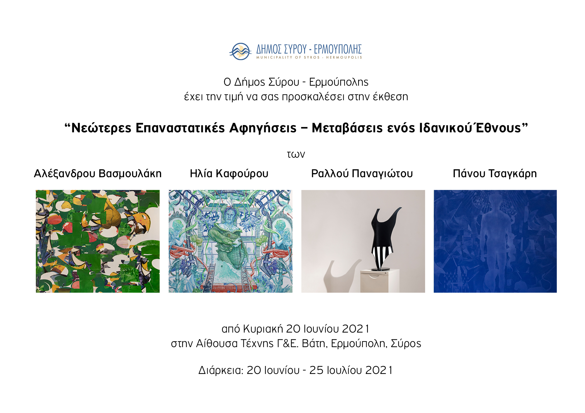Η εσωστρέφεια πρέπει να πάψει να κατατρέχει την πρόοδο και η ελληνοκεντρική αντίληψη της δημιουργίας να μην είναι αποκομμένη από τα οφέλη της διεθνοποίησης. Η εξωστρέφεια, η σύμπλευση και ο σεβασμός στη διαφορετικότητα να γίνουν οι φάροι της νεωτερικότητας που θα οδηγήσουν στην εξέλιξη, τη δημιουργία και την διεθνή αναγνώριση. Οι Αλέξανδρος Βασμουλάκης, Ηλίας Καφούρος, Ραλλού Παναγιώτου και Πάνος Τσαγκάρης, σύγχρονοι έλληνες εικαστικοί, προσαρμοσμένοι στις διεθνείς τάσεις με διαφορετικές όμως προσεγγίσεις, μεταφέρουν την έννοια της Επανάστασης δυναμικά στο παρόν, σε μια κρίσιμη περίοδο μετάβασης, κρίσης και αναμονής, αμφισβήτησης και έκπτωσης των κοινωνικών ιδεολογιών.