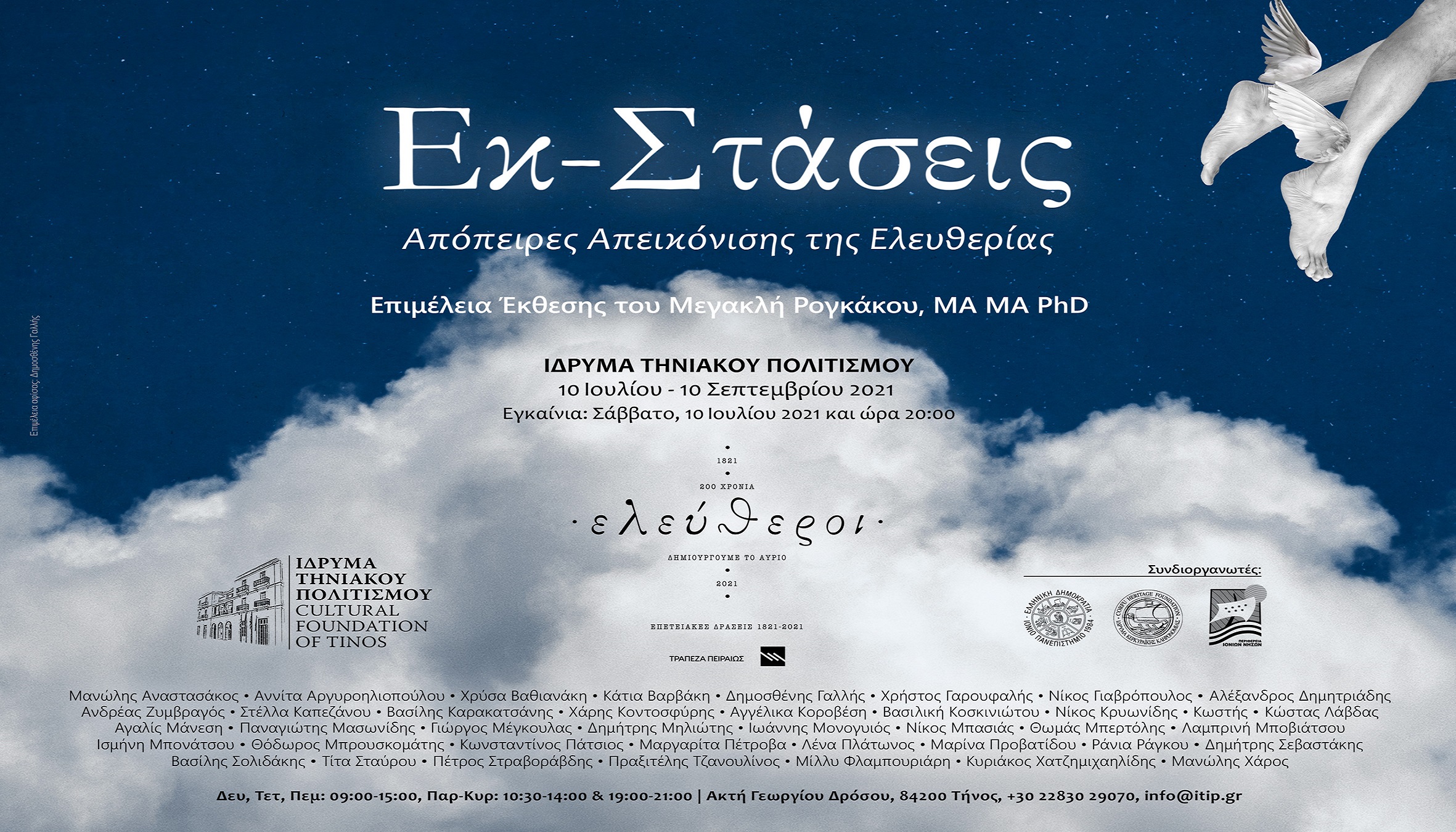 Το Ίδρυμα Τηνιακού Πολιτισμού σε συνεργασία με το Ίδρυμα Κερκυραϊκής Κληρονομιάς και με την ευγενική χορηγία της Τράπεζας Πειραιώς παρουσιάζει την εικαστική έκθεση «Εκ-Στάσεις: Απόπειρες Απεικόνισης της Ελευθερίας» υπό την επιμέλεια του Δρος Ιστορικού Τέχνης Μεγακλή Ρογκάκου.