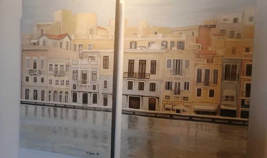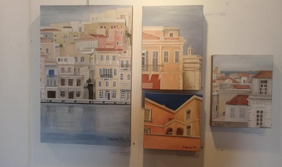 Κατά τη διάρκεια του εγκλεισμού, το μυαλό της Νίκης Δράκου η οποία ζει μόνιμα στη Θεσσαλονίκη έτρεχε στη Σύρο… το «νησάκι» της, όπως αποκαλεί η ίδια. Αναρωτιόταν για τις συνθήκες που επικρατούσαν εκεί. Πώς ήταν η Ερμούπολη χωρίς τους κατοίκους της να τριγυρνούν και να βρίσκονται παρέες-παρέες στην παραλία της; Έτσι, άρχισε να ζωγραφίζει κομμάτια της παραλίες της Ερμούπολης χωρίς τους ανθρώπους της. Στις ελαιογραφίες της, μόνο τα κτίρια είναι αυτά που δηλώνουν την ταυτότητα της πόλης. Πολλά εξ’ αυτών είναι σημεία αναφοράς από γενιά σε γενιά, κρύβουν ιστορίες και αναμνήσεις. Ωστόσο, η ίδια δε θέλησε να αποτυπώσει τα επώνυμα, αγαπημένα, πανέμορφα και πολυζωγραφισμένα κτίρια, όπως το Δημαρχείο, το Θέατρο Απόλλων ή ο Ι.Ν. του Αγίου Νικολάου. Της έφτανε να παρατηρεί τα χρώματα σε ανώνυμα κτίρια και πώς καθρεπτίζονται τα νερά του λιμανιού ή της βροχής. Αφιέρωσε πολλές στιγμές με βροχή στην άδεια πλατεία και στα χρώματα των σπιτιών της πόλης: στα γκρι, στα σομόν, στα γαλάζια, στα εκρού, σε κάτι πινελιές έντονου κεραμιδί ή μπορντό, τονισμένα από το νερό, λίγο μουντά από το χρώμα του ουρανού, λίγο φωτεινά από τα μάρμαρα.