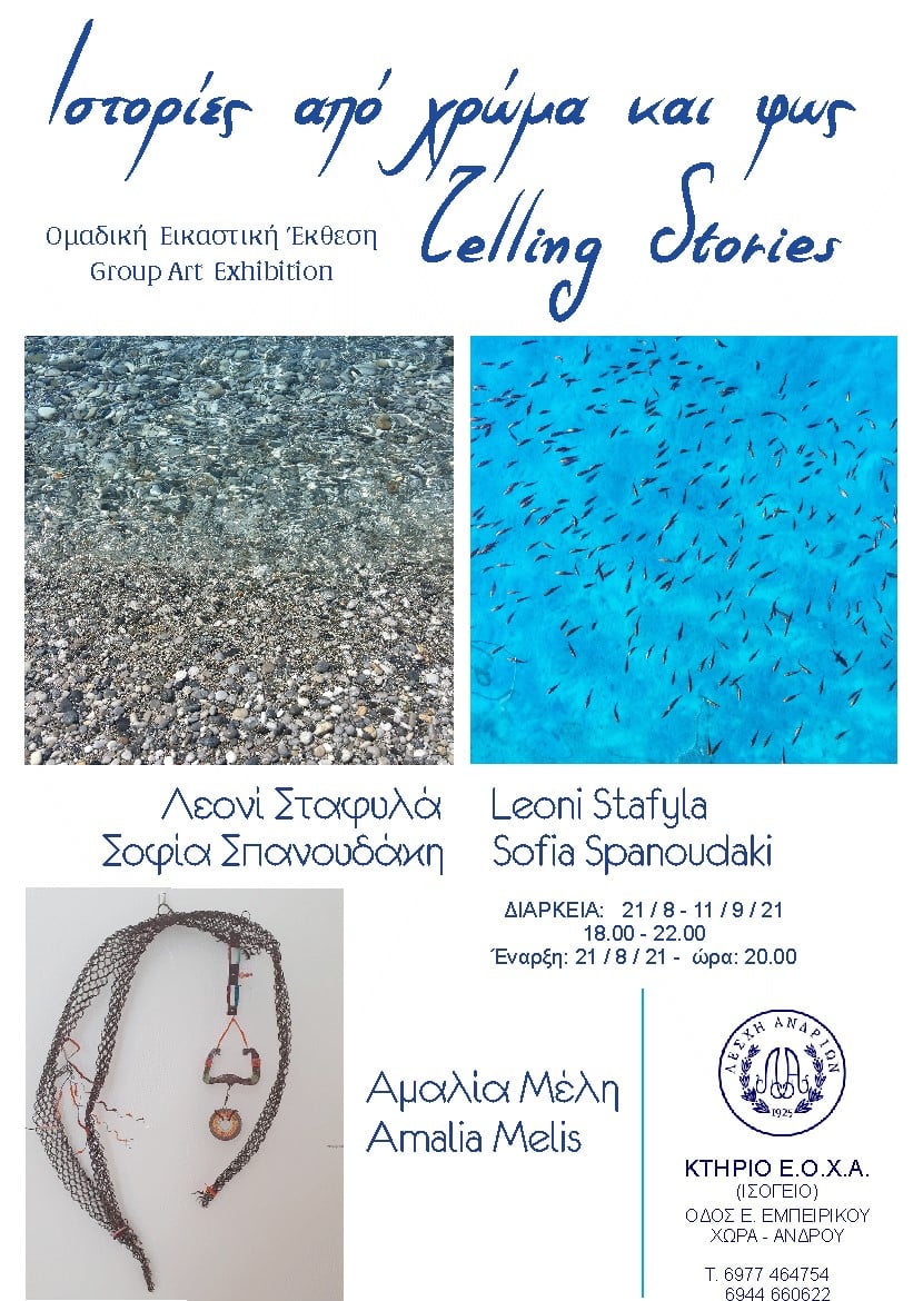 Μετά την ευγενική πρόσκληση της Λέσχης Ανδρίων, στην προσπάθεια της να διευρύνει τις πολιτιστικές δραστηριότητες της Λέσχης, από το Σάββατο 21/8/2021 έχουμε την χαρά να σας υποδεχθούμε στο πλαίσιο της φιλοξενίας της ομαδικής μας έκθεσης «Ιστορίες από Χρώμα και Φως/Telling Stories». Η Λεονί Σταφυλά και η Σοφία Σπανουδάκη εκθέτουμε φωτεινά κουτιά με εικόνες γεμάτες καλοκαίρι και φως, σαν παρηγοριά στις σκοτεινές μέρες που ζήσαμε τον Αύγουστο σε όλη την χώρα, η δε Αμαλία Μέλη τα ιδιαίτερα γλυπτά της από θραύσματα παλαιών οικοσκευών που παίρνουν ζωή από τα χρώματα που τα ντύνει, με την έμπνευση που οδηγεί τα χέρια της και την φαντασία που αποδίδει τους τίτλους που τα συνοδεύουν.