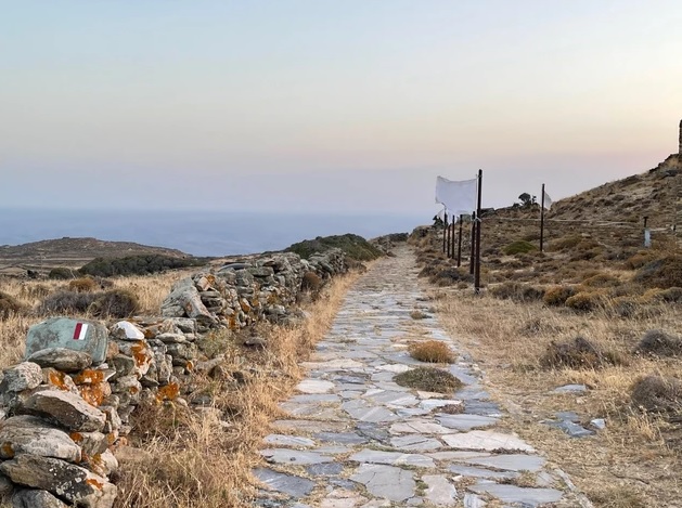 Οι σημαίες που σηματοδοτούν αυτήν την διαδρομή (Ίδρυμα Τηνιακού Πολιτισμού στη Χώρα, Χάνι Κυρα-Ξένης, Τριπόταμος, Κτικάδος, Εξώμβουργο)*  είναι εμπνευσμένες από την κυκλαδίτικη αρχιτεκτονική και αποτελούνται από ανακυκλωμένα προϊόντα του τουρισμού (σεντόνια, πετσέτες, τραπεζομάντηλα των ξενοδοχείων του νησιού). Ενώ ο Τριπόταμος επιλέχθηκε ως φόρος τιμής στον Κορνήλιο Καστοριάδη, ο οποίος περνούσε εκεί τα καλοκαίρια του, οι υπόλοιπες διαδρομές προέκυψαν γύρω από τα διαχρονικά μονοπάτια της περιοχής μέσα από τις συναντήσεις τής εικαστικού και της επιμελήτριας με ντόπιους.