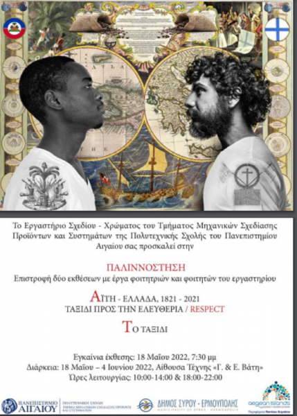 Στην «Αϊτή-Ελλάδα 1821-2021, ταξίδι προς την Ελευθερία, respect», ο κάθε φοιτητής δίνει μια δική του εκδοχή γιατί αυτή η ιστορία, στην πραγματικότητα δεν επαληθεύτηκε ποτέ. Τη γνωρίζουμε μόνο από ένα γράμμα που είχε στείλει ο Πρόεδρος της Αϊτής στον Αδαμάντιο Κοραή και σε αυτό το γράμμα είχε εκδηλώσει την πρόθεσή του να στείλει βοήθεια στην Ελλάδα. Ένα καράβι με 100 εθελοντές, πρώην σκλάβους (γιατί ήταν πλέον ελεύθεροι εφόσον είχαν κερδίσει την ανεξαρτησία τους ), μαζί με 45 τόνους καφέ όπου θα τους πουλούσαν και τα χρήματα θα τα χρησιμοποιούσαν στον αγώνα για την ανεξαρτησία της Ελλάδας. Αυτήν την ιστορία βέβαια, ο κάθε φοιτητής την ερμηνεύει με τον δικό του τρόπο και έτσι θα δείτε πάρα πολλά καράβια που βυθίζονται από διαφορετικές αιτίες. Από πειρατικά καράβια, από θαλασσοταραχή, από φανταστικά όντα κτλ. Αυτό έχει ένα ιδιαίτερο ενδιαφέρον διότι βλέπουμε μια διαφορετική αποτύπωση της ιστορίας μέσα από μια σύγχρονη ματιά. Ο καθένας εκφράζεται με τον δικό του τρόπο και δίνει ένα δικό του τέλος.