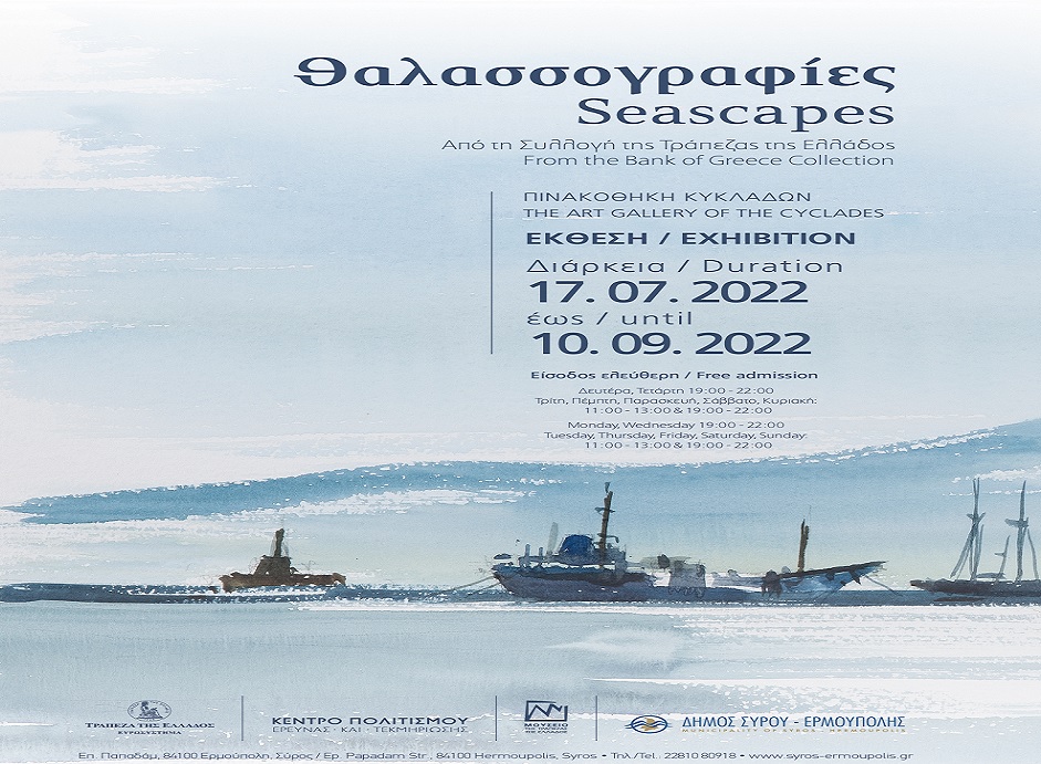 Το Κέντρο Πολιτισμού, Έρευνας και Τεκμηρίωσης της Τράπεζας της Ελλάδος και ο Δήμος Σύρου-Ερμούπολης παρουσιάζουν την έκθεση με τίτλο Θαλασσογραφίες. Από τη Συλλογή της Τράπεζας της Ελλάδος, που θα φιλοξενηθεί στην Πινακοθήκη Κυκλάδων στην Ερμούπολη Σύρου.