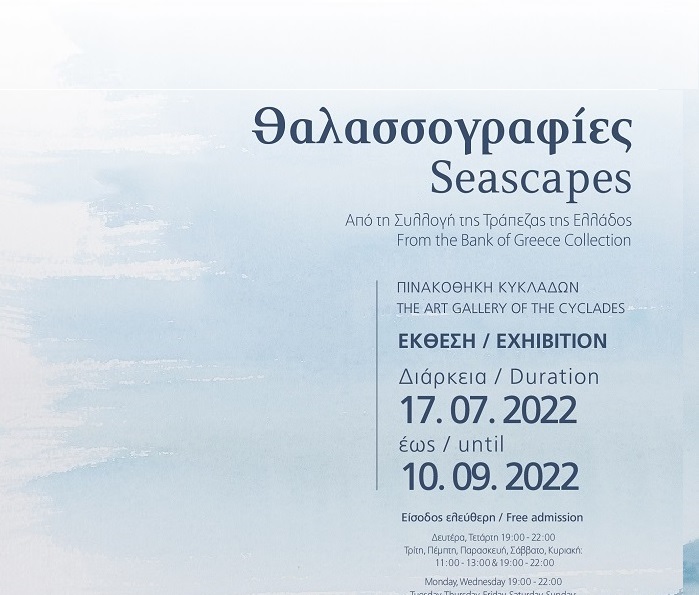 Μέχρι και το Σάββατο 24 Σεπτεμβρίου παρατείνεται η έκθεση με τίτλο “Θαλασσογραφίες. Από τη Συλλογή της Τράπεζας της Ελλάδος”, που φιλοξενείται στην Πινακοθήκη Κυκλάδων στην Ερμούπολη Σύρου. Η παράταση κρίθηκε επιβεβλημένη λόγω της μεγάλης προσέλευσης του κοινού, το οποίο μπορεί για δύο ακόμη εβδομάδες να θαυμάσει 51 θαλασσογραφίες σημαντικών Ελλήνων ζωγράφων από τα μέσα του 19ου αιώνα έως τη σύγχρονη εποχή.