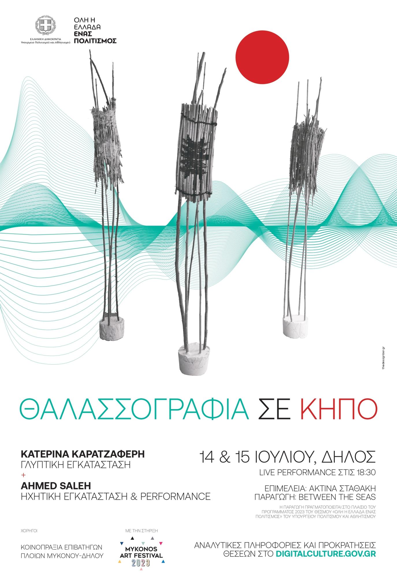 Υπο τον τίτλο "Θαλασσογραφία σε κήπο" διαφορετικά πολιτισμικά αφηγήματα για την προστασία και τους κινδύνους του φυσικού περιβάλλοντος, Ιαπωνικές και Ελληνικές παραδόσεις, μέσα απο τη γλυπτική εγκατάσταση της Κατερίνας Καρατζαφέρη, συναντούν τις προσωπικές ακουστικές μνήμες του Ahmed Saleh απο το λιμάνι της Αλεξανδρείας, και συνομιλούν με την αρχαιολογία, την ιστορική μνήμη, τη φύση και τον μύθο όπως αυτά εντυπώνονται στον ιστορικό και συμβολικό χώρο της Δήλου.