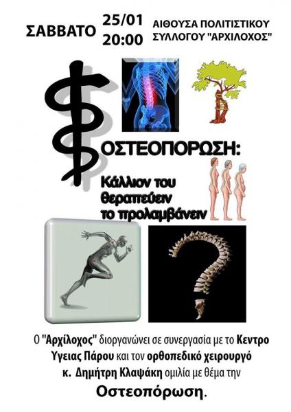 Έτσι λοιπόν ο "Αρχίλοχος" διοργανώνει σε συνεργασία με το Κεντρο Υγειας Πάρου και τον κ. Δημήτρη Κλαψάκη ορθοπεδικό χειρουργό ομιλία με θέμα την Οστεοπόρωση, το Σάββατο 25 Ιανουαρίου στις 20:00.