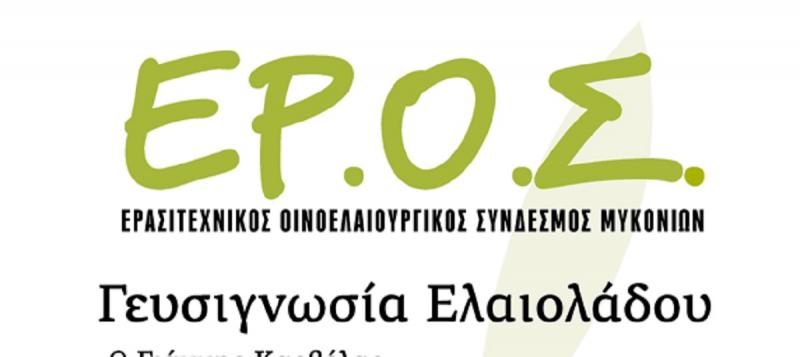 Μία "γευστική" εκδήλωση με τίτλο "Γευσιγνωσία Ελαιολάδου" διοργανώνεται από τον Ερασιτεχνικό Οινοελαιουργικό Σύνδεσμο Μυκονίων (Ε.Ρ.Ο.Σ.) το Σάββατο στις 8 το βράδυ στο παλαιό λιμάτι της Μυκόνου στο cafe Μπάρκο.
