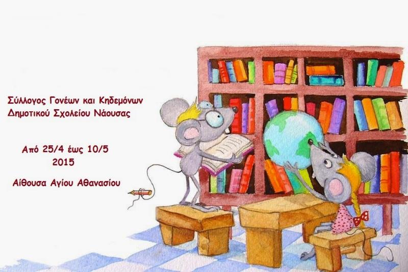 Ο Σύλλογος Γονέων και Κηδεμόνων Δημοτικού Σχολείου Νάουσας σας προσκαλεί στην 5η Έκθεση Βιβλίου που θα πραγματοποιηθεί από το Σάββατο 25 Απριλίου 2015 έως και την Κυριακή 10 Μαΐου 2015, στην αίθουσα τέχνης Αγ. Αθανασίου στη Νάουσα.