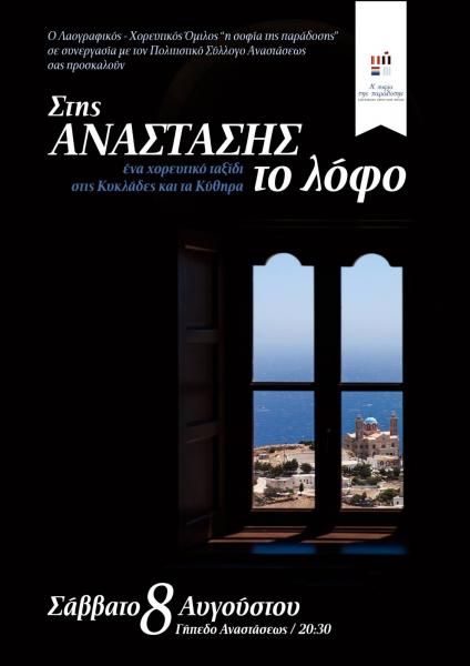 Ο Λαογραφικός - Χορευτικός Όμιλος "η σοφία της παράδοσης" σε συνεργασία με το Πολιτιστικό Σύλλογο Αναστάσεως σας προσκαλούν "Στης Ανάστασης το λόφο", ένα χορευτικό ταξίδι στις Κυκλάδες και τα Κύθηρα, το Σάββατο 8 Αυγούστου 2015 στις 20:30, στο λόφο της Ανάστασης (γήπεδο μπάσκετ).