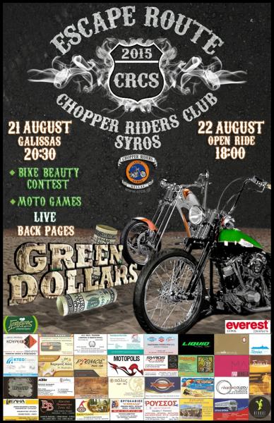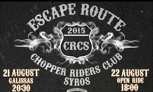 Το Chopper Riders Club Syros διοργανώνει το party ESCAPE ROUTE την Παρασκευή 21 Αυγούστου στις 20:30 στο café bar “Green Dollars” στο Γαλησσά.