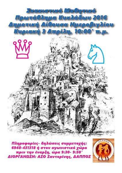 Ο Αθλητικός Σκακιστικός Όμιλος Σαντορίνης (ΑΣΟΣ) και ο Δημοτικός Αθλητικός Πολιτιστικός Περιβαλλοντικός Οργανισμός Θήρας (ΔΑΠΠΟΣ) προκηρύσσουν το Σκακιστικό Μαθητικό Πρωτάθλημα Κυκλάδων 2016.