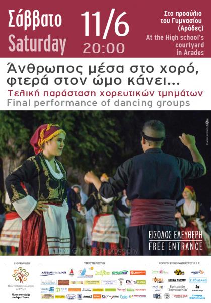 Συγκεκριμένα, το Σάββατο 11/6 στις 20:00 θα πραγματοποιηθεί στο προαύλιο του Γυμνασίου (Αράδες) η τελική παράσταση των χορευτικών τμημάτων του Συλλόγου με τον τίτλο «Άνθρωπος μέσα στο χορό, φτερά στον ώμο κάνει»…