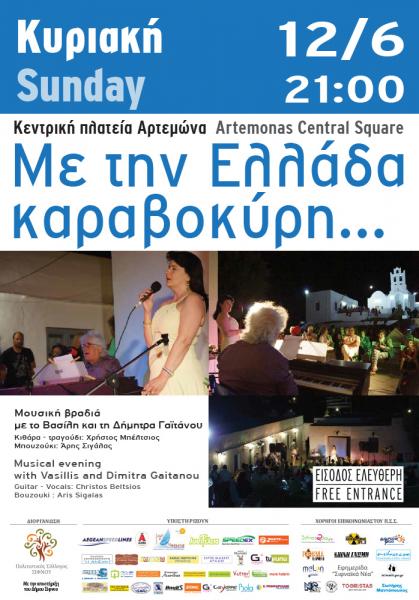 Την Κυριακή 12/6 στις 21:00 στην κεντρική πλατεία Αρτεμώνα θα πραγματοποιηθεί μουσική βραδιά με το Βασίλη και τη Δήμητρα Γαϊτάνου με τον τίτλο «Με την Ελλάδα καραβοκύρη» …