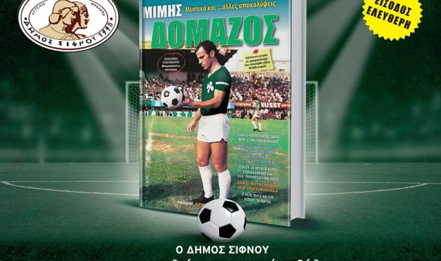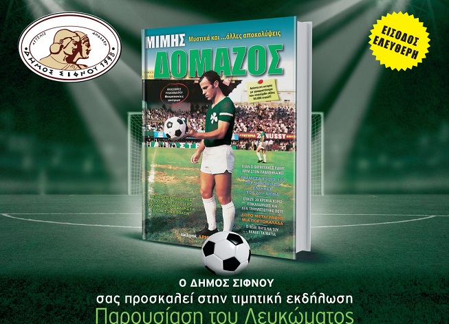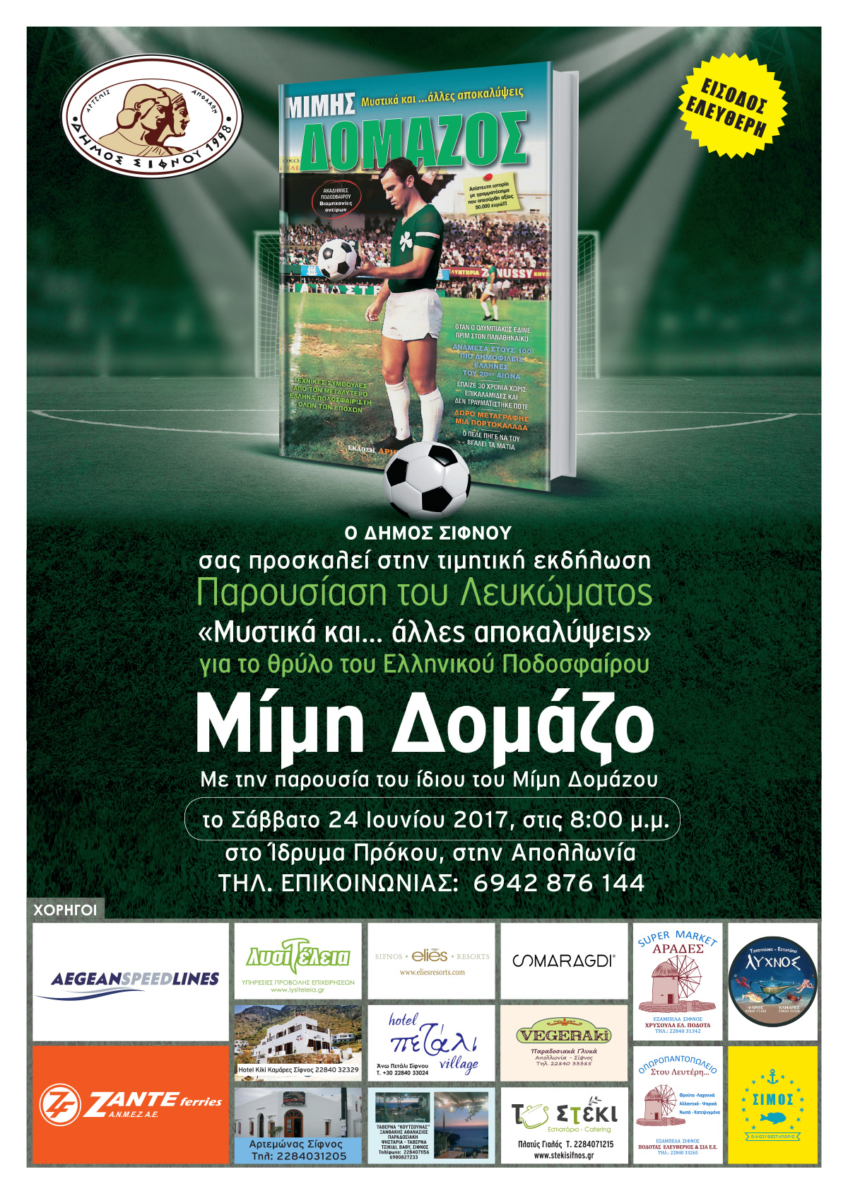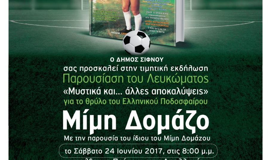 Ο Δήμος Σίφνου σας προσκαλεί στην τιμητική εκδήλωση - παρουσίαση λευκώματος «Μυστικά κι… άλλες αποκαλύψεις» για τον θρύλο του Ελληνικού Ποδοσφαίρου Μίμη Δομάζο στις 24/6/2017 και ώρα 20.00 στο Ίδρυμα Πρόκου στην Απολλωνία.