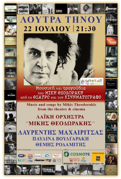 Το Φεστιβάλ Τήνου προσκαλεί τους φίλους του νησιού στα Λουτρά για μια μουσική βραδιά με τραγούδια του Μίκη Θεοδωράκη από το θέατρο και τον κινηματογράφο.
