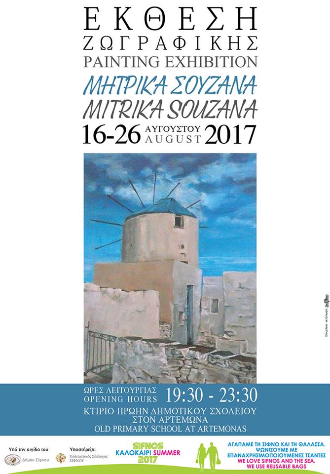Στο κτήριο του Πρώην Δημοτικού Σχολείου Σίφνου στον Αρτεμώνα εγκαινιάζεται απόψε στις 20:00 η έκθεση ζωγραφικής της Σουζάνας Μήτρικα, η οποία θα διαρκέσει έως 26 Αυγούστου 2016.