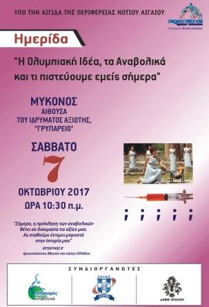 Στα πλαίσια των Αιγαιοπελαγίτικων Αγώνων Στίβου (7 και 8 Οκτωβρίου) που θα πραγματοποιηθούν φέτος στη Μύκονο, η μη κερδοσκοπική εταιρεία μας ¨Αθλητισμός Χωρίς Αναβολικά¨ – σε συνεργασία και με τη στήριξη του ΣΕΓΑΣ και του Δήμου Μυκόνου – θα πραγματοποιήσει το Σάββατο 7 Οκτωβρίου και ώρα 10:30π.μ. στην Αίθουσα του Ιδρύματος Αξιώτης ¨Γρυπάρειο¨, ¨Ημερίδα¨ με θέμα ¨Η Ολυμπιακή Ιδέα, τα Αναβολικά, και τι πιστεύουμε εμείς σήμερα¨.