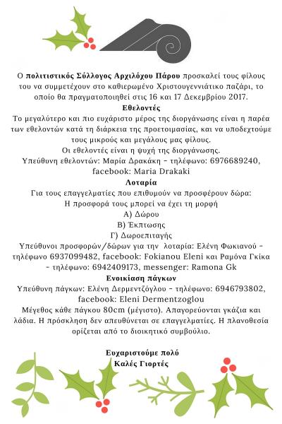 Σε ένα διήμερο χριστουγεννιάτικο παζάρι καλεί όλους τους πολίτες της Πάρου ο Πολιτιστικός Σύλλογος του Αρχιλόχου, στο πλαίσιο των εορταστικών ημερών και συγκεκριμένα στις 16 και 17 Δεκεμβρίου.