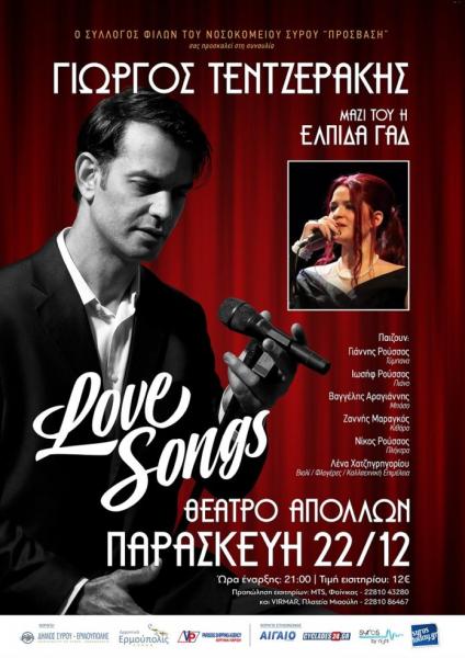 Σας ενημερώνουμε ότι ο Σύλλογος Φίλων Νοσοκομείου Σύρου και ο Σύλλογος Καρκινοπαθών & Φίλων Ν. Κυκλάδων διοργανώνουν χριστουγεννιάτικη συναυλία με τον Γιώργο Τεντζεράκη και την ελπίδα Γαδ, με τίτλο “Love songs” την Παρασκευή 22/12/2017 και ώρα 9 μ.μ. στο Θέατρο Απόλλων.