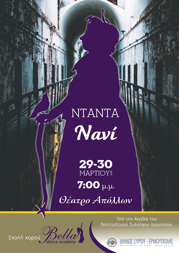 Η Σχολή Χορού Bella Dance Academy, υπό την αιγίδα του Πολιτιστικού Συλλόγου Χρουσσών, παρουσιάζει, στο Θέατρο Απόλλων, τη θεατρομουσικοχορευτική παράσταση «Η Νταντά Νανί», στις 29 και 30 Μαρτίου 2018 και ώρα 19:00.