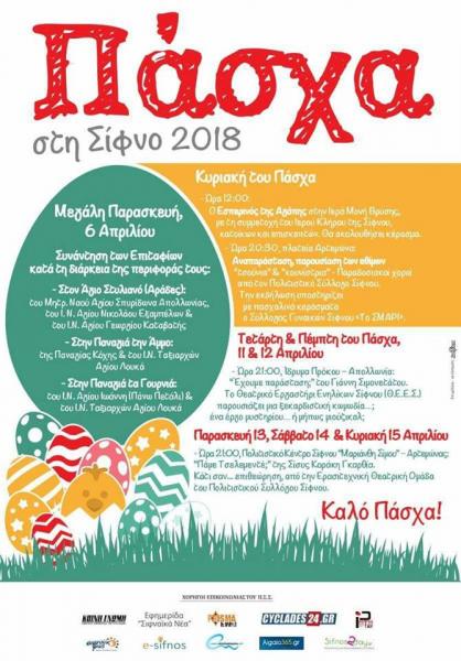 Ο Πολιτιστικός Σύλλογος Σίφνου προσκαλεί κατοίκους και επισκέπτες της Σίφνου στις εκδηλώσεις που θα πραγματοποιηθούν τις ημέρες του Πάσχα.