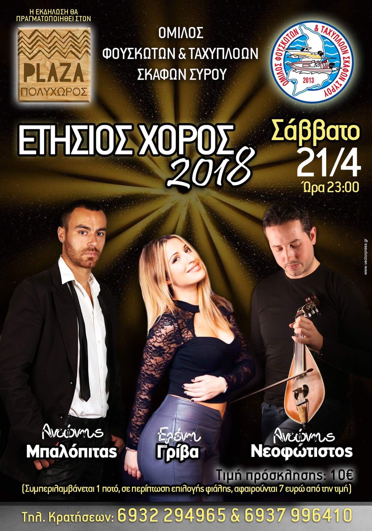 Την ετήσια χοροεσπερίδα του διοργανώνει ο Όμιλος Φουσκωτών και ταχύπλοων Σκαφών Σύρου στις 21 Απριλίου (23.00), στον πολυχώρο plaza.