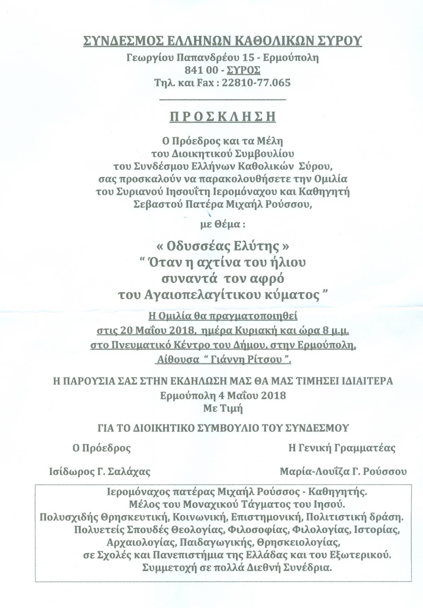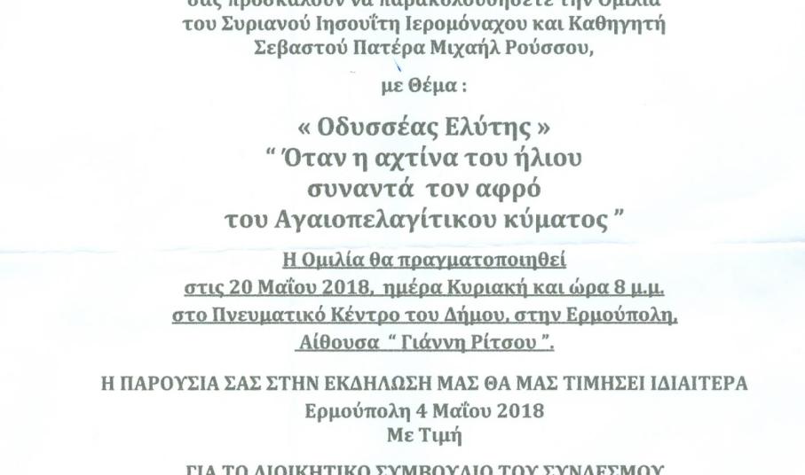 Σε ομιλία με θέμα "Οδυσσέας Ελύτης. Όταν η αχτίνα του ήλιου συναντά τον αφρό του αιγαιοπελαγίτικου κύματος" καλεί όλους τους πολίτες της Σύρου η Καθολική Επισκοπή Σύρου, η οποία και θα πραγματοποιηθεί στο Πνευματικό Κέντρο του Δήμου Σύρου - Ερμούπολης.