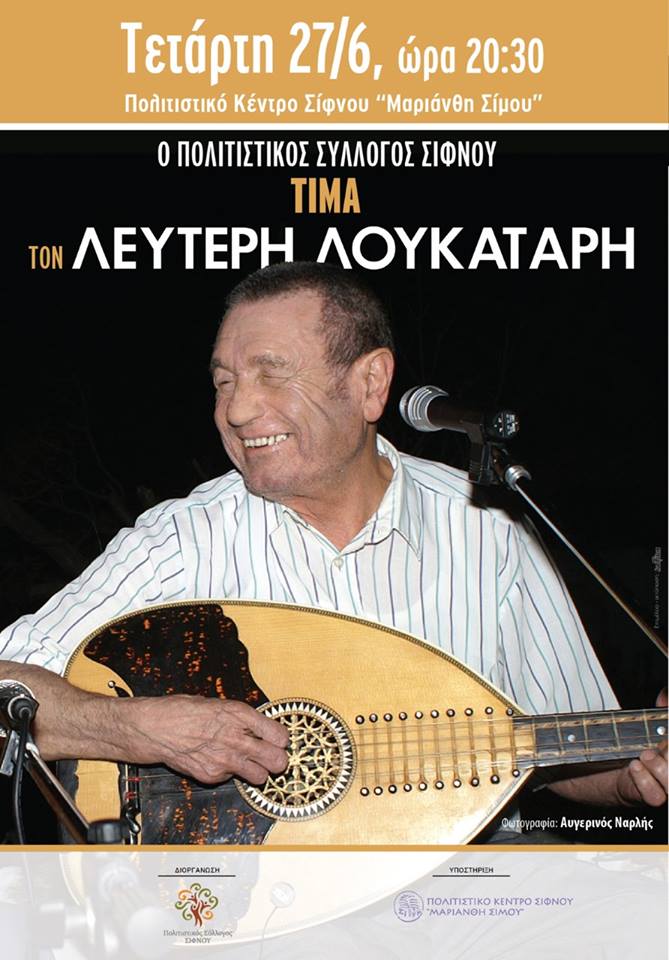 Ο Πολιτιστικός Σύλλογος Σίφνου τιμά τον Λευτέρη Λουκατάρη, απόψε στις 20:30, στο Πολιτιστικό Κέντρο Σίφνου "Μαριάνθη Σίμου"