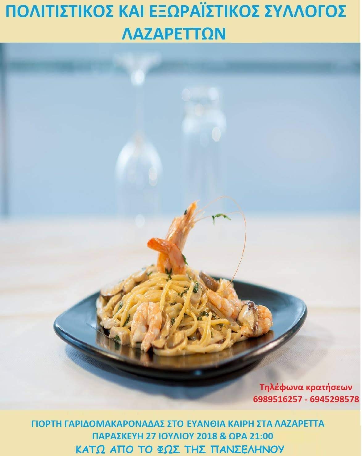 Από το Διοικητικό Συμβούλιο του Πολιτιστικού και Εξωραϊστικού Συλλόγου Λαζαρέττων αποφασίστηκε ομόφωνα την αναβολή τις προγραμματισμένης Γιορτής τις Γαριδομακαρονάδας στις 27 Ιουλίου 2018 θα πραγματοποιηθεί την παρασκευή 10 Αυγούστου 2018.