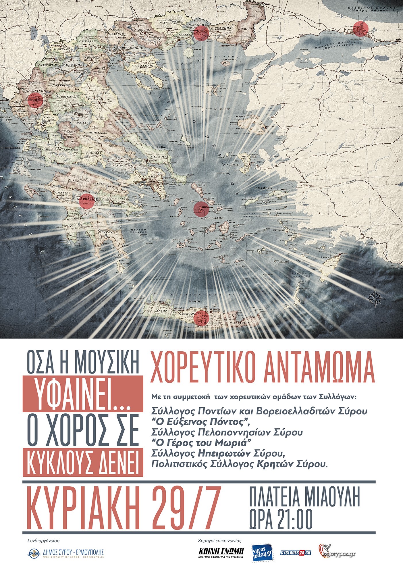 Την Κυριακή 29 Ιουλίου 2018 και ώρα 21:00, στην Πλατεία Μιαούλη, θα πραγματοποιηθεί το χορευτικό αντάμωμα «Όσα η μουσική υφαίνει… ο χορός σε κύκλους δένει», με τη συμμετοχή των χορευτικών ομάδων των Συλλόγων Ποντίων και Βορειοελλαδιτών «Ο Εύξεινος Πόντος», των Πελοποννησίων Σύρου «Ο Γέρος του Μωριά», των Ηπειρωτών Σύρου και των Κρητών Σύρου.