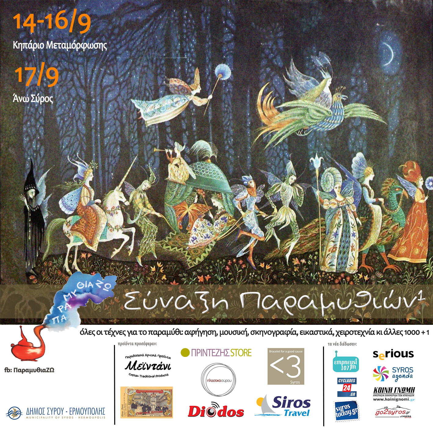 Η ομάδα αφηγητών ΠαραμυθιαΖΩ, υπό την αιγίδα του Δήμου Σύρου-Ερμούπολης, διοργανώνει την Σύναξη Παραμυθιών1, από τις 14 μέχρι τις 17 Σεπτεμβρίου, στη Σύρο, στο Κηπάριο της Μεταμόρφωσης και στην Άνω Σύρο. Ένα τετραήμερο όπου συναντιούνται Τέχνες γύρω από το παραμύθι: μουσική, σκηνογραφία, εικαστικά, θέατρο, χειροτεχνία κι άλλες χίλιες και μια.