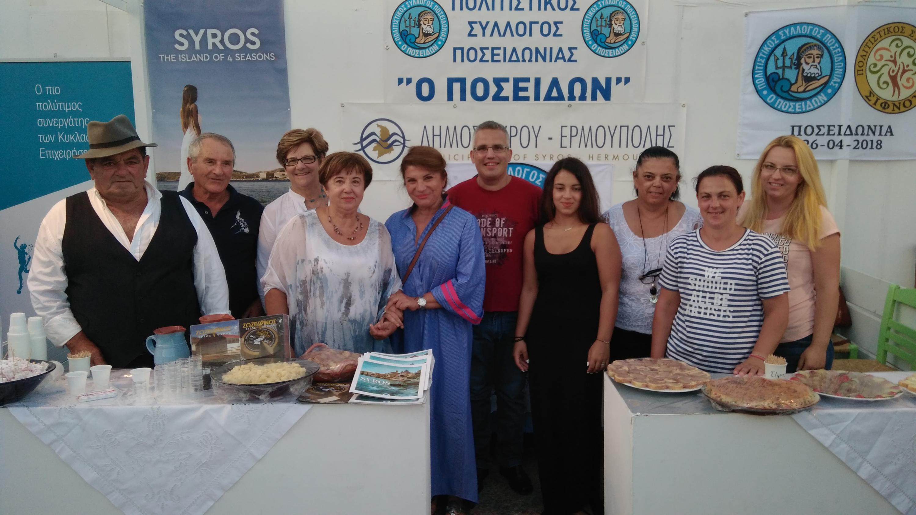 Στο πλαίσιο του 12ου Φεστιβάλ Κυκλαδικής Γαστρονομίας «Νικόλαος Τσελεμεντές», που διοργανώθηκε στο νησί της Σίφνου στις 6, 7 και 8 Σεπτεμβρίου 2018, η Σύρος συμμετείχε για άλλη μια χρονιά με 10μελή αντιπροσωπεία και έκλεψε τις εντυπώσεις με την άψογη παρουσία του περιπτέρου της. Επικεφαλής της αποστολής ήταν ο Πρόεδρος της Τοπικής Κοινότητας Ποσειδωνίας,  κ. Δημήτρης Νταλαχάνης, ως εκπρόσωπος του Δήμου Σύρου - Ερμούπολης, με τη συμμετοχή του Πολιτιστικού Συλλόγου «Ο Ποσειδών».